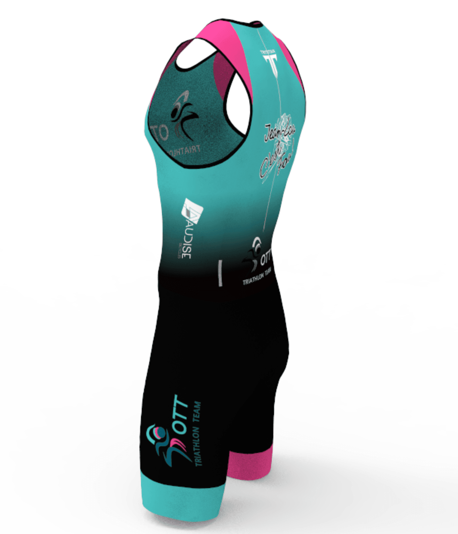 Équipé d’une peau de chamois de triathlon de 6 mm d’épaisseur à l’arrière et de 4 mm d’épaisseur à l’avant, haute densité, perforée, faite d’une microfibre respirante et qui évacue l’eau.