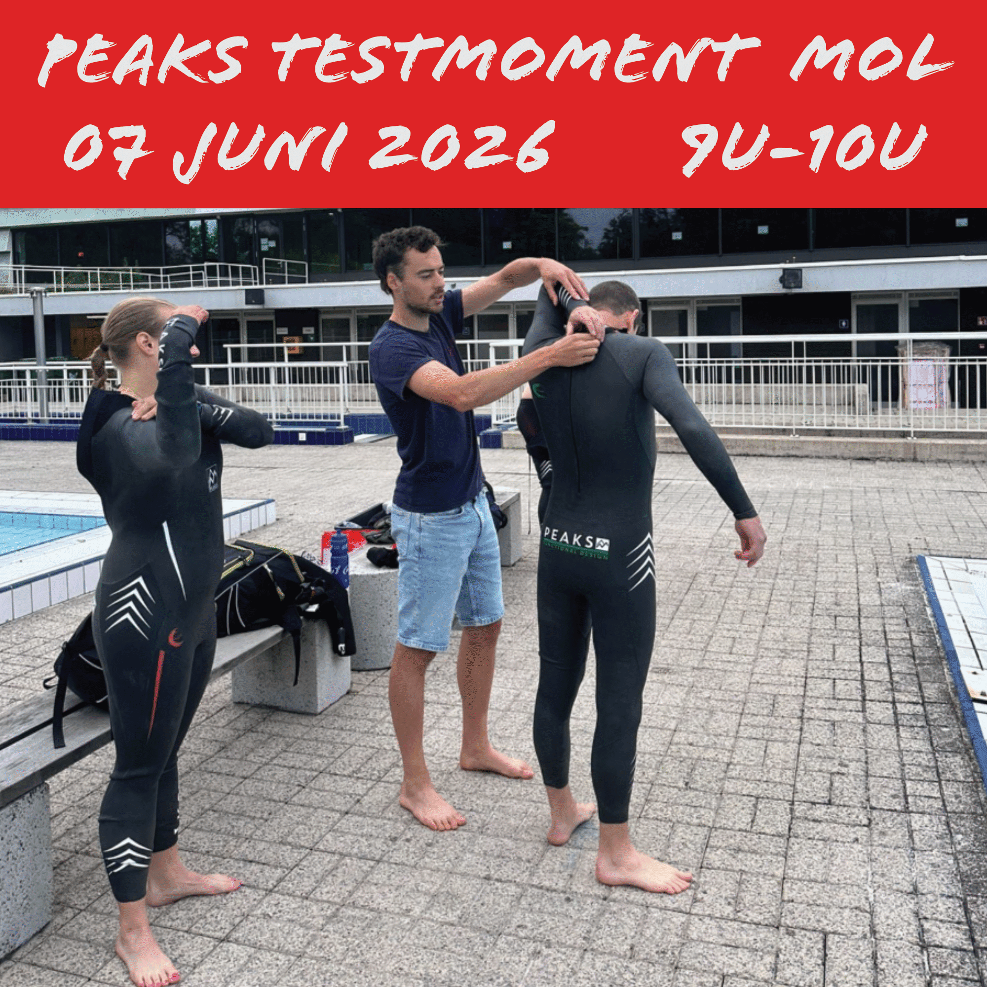 Op zondag 7 juni van 9u tot 10u kan je terecht in het openlucht zwembad van Mol om de verschillende wetsuits van Peaks te testen. De wetsuit testdag wordt er georganiseerd door Xterra-triatleet Lucas Van Deynze die je persoonlijk avies geeft over de verschillende modellen en tips en tricks over het aan- en uittrekken van de wetsuits en het zwemmen met wetsuit. Onder andere onze olympische triatlete Jolien Vermeylen of de beste riatlonzwemmer Alessio Crociani, of praktisch alle Belgian Hammers zwemmen met de Peaks Azul.