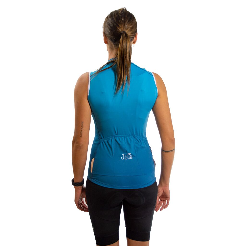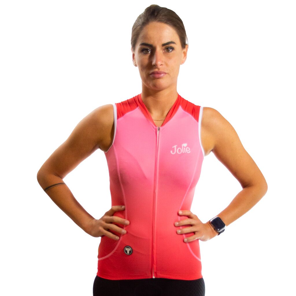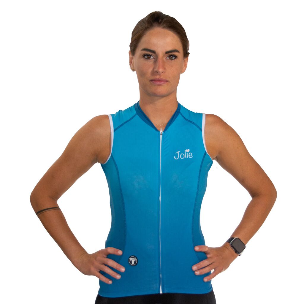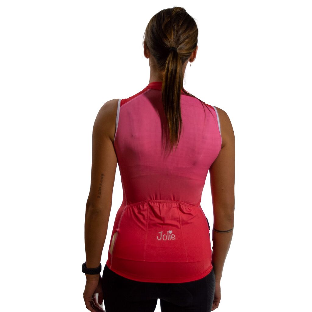 Deze Jolie pro no sleeve fietstrui bestaat uit de beste polyamide met 20% elastaan. De stoffen zijn verkoelend en waterafvoerend. Ze moeten strak gedragen worden om volledig tot hun recht te komen.