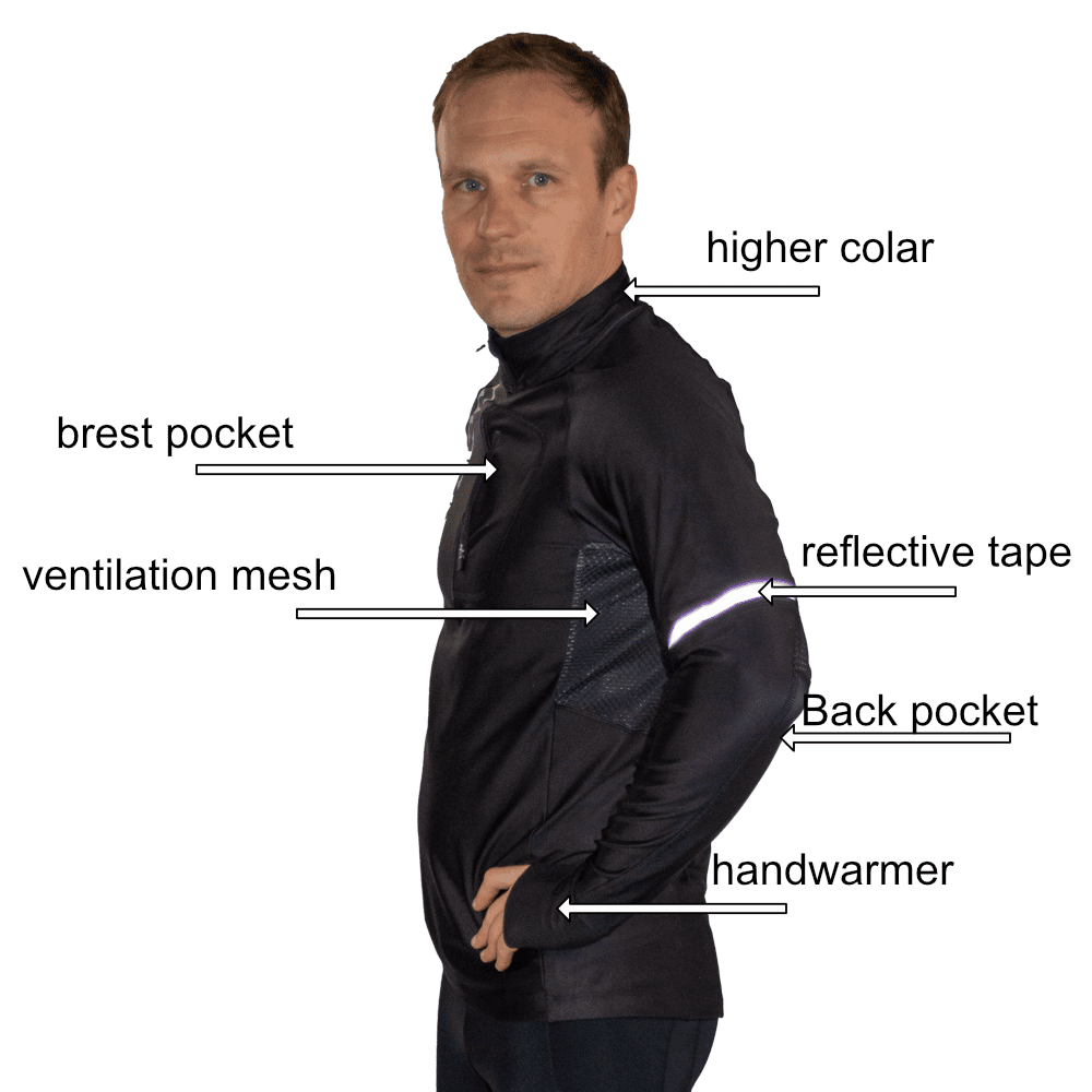 De stof is een gevoerde fleece gebruikt voor truien in de herfst of bij winters bij koud weer. De binnenkant van het kledingstuk is geborsteld zodat het warm en zacht aanvoelt tegen de huid. De cut is slim fit en sluit dus mooi aan zodat het flapperen in de wind van je trui niet voor luchtweerstand zorgt.